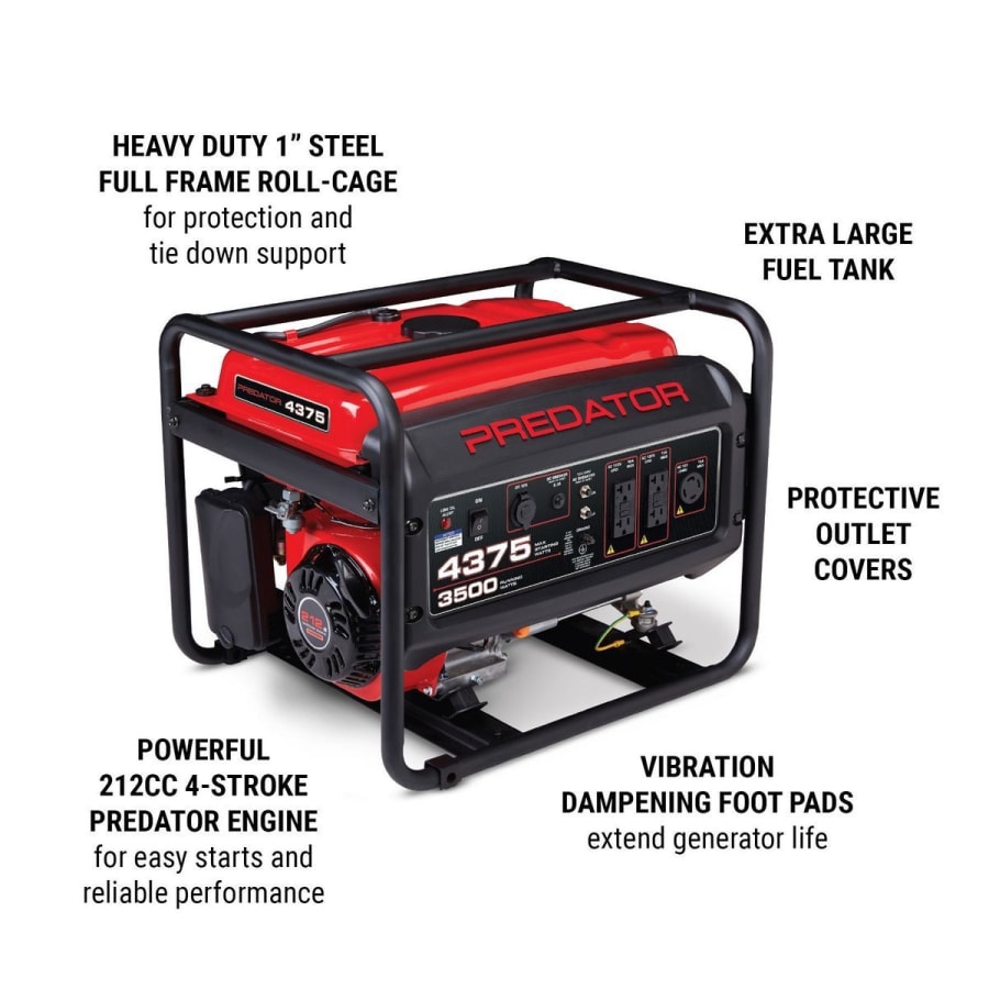 Powered by a reliable gas engine, this generator is ideal for emergencies, job-sites, food trucks, and outdoor recreation. GFCI outlets, larger fuel tank, longer run time make this generator an unbeatable value. 4375 starting watts and 3500 running watts make this unit capable of powering several home essentials during an outage or providing power on the go. Our new, larger gas tank means you can enjoy run times up to 16 hours @ 50% load. Runtime up to 16 hours @ 50% load Heavy duty 1 in. steel roll cage Low oil indicator / low oil shutdown 212cc, 6.5 HP air-cooled OHV gas engine UL listed circuit breakers (4) 120v GFCI outlets, 3 prong, (1) 120/240v twist lock outlet, 4 prong, (1) 12v DC outlet