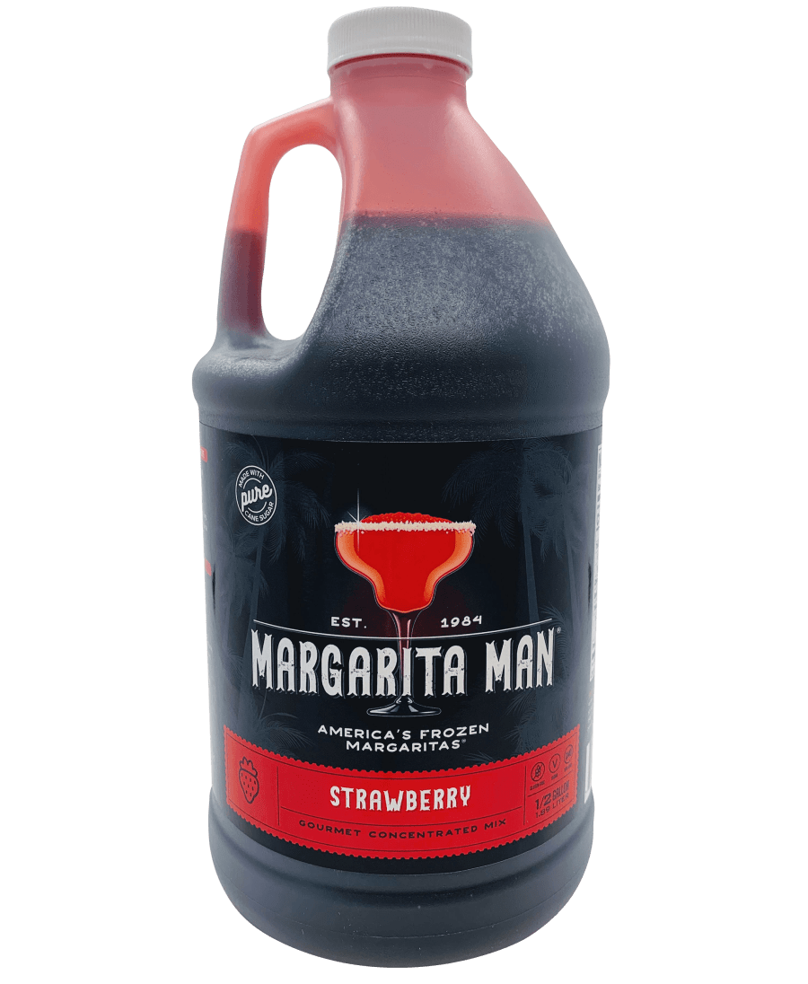 Strawberry mix concentrate. Made with organic puréed strawberries and other natural, organic strawberry flavors. One half-gallon of concentrate produces 3.5 gallons of frozen strawberry daiquiris or strawberry margaritas and yields 56 drinks (8-ounces each) with alcohol mixed in, or 48 non-alcoholic slushies.