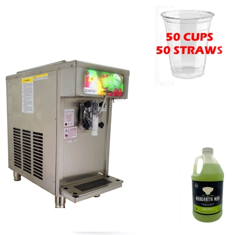 This rental with Mikes Margarita Machines rentals will include the machine, enough cups and straws for 50 guests, and your first batch of 5 Gallons (640 ounces) of mix pre-mixed and ready to serve.
